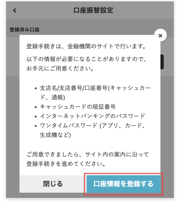 金融機関によって、支店名、支店番号、口座番号、キャッシュカードの暗証番号、インターネットバンキングのパスワード、ワンタイムパスワード(アプリ、カード、生成機など)などが必要になります。 注意:これ以降は中断せずに登録完了画面が表示されるまで手順を進められるようにご準備ください。途中でブラウザ画面を閉じたり長時間ブラウザ画面を放置すると登録失敗と見なされます。