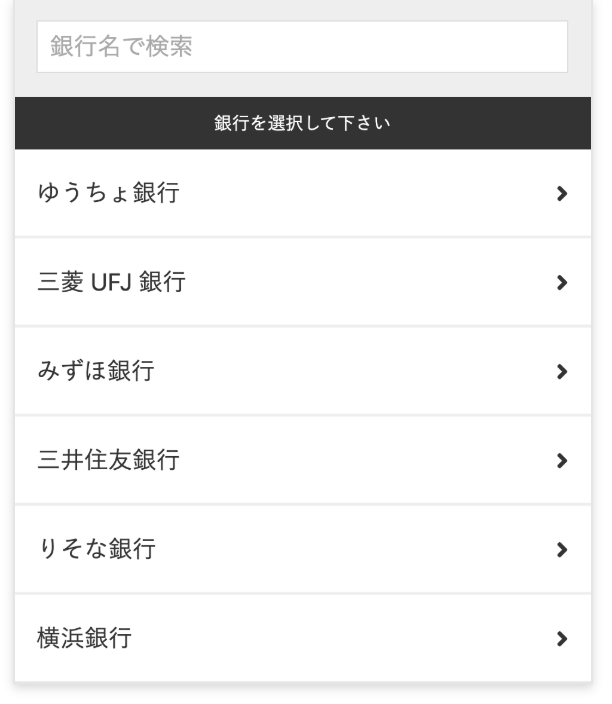 5.表示された銀行の一覧から、登録する口座のある銀行を選択します。検索のテキストボックスで銀行名を入力して、一覧に検索結果を表示することもできます。