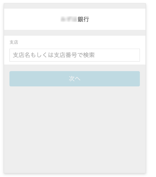 6.支店についての検索のテキストボックスが表示された場合、検索のテキストボックスに支店名または支店番号を入力して一覧に検索結果を表示します。該当の支店を選択し、[次へ]をタップします。 注意:選択した銀行によって、必要な入力内容が異なります。