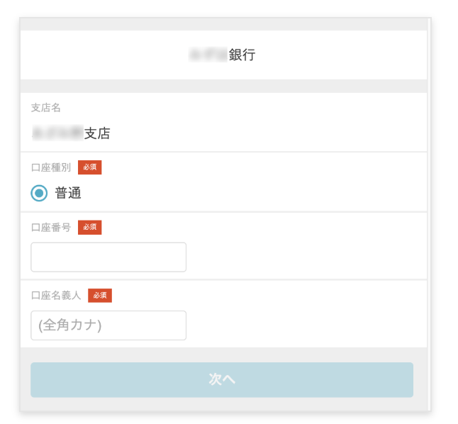 7.表示された画面で、口座種別、口座番号、口座名義人など必要な情報を入力して、[次へ]をタップします。 注意:選択した銀行によって、必要な入力内容が異なります。